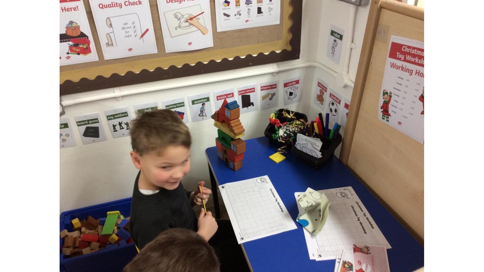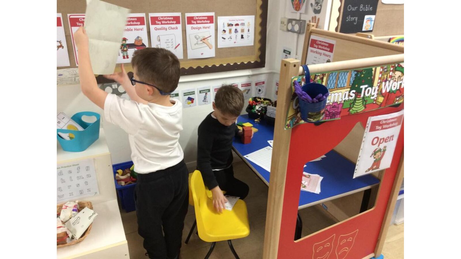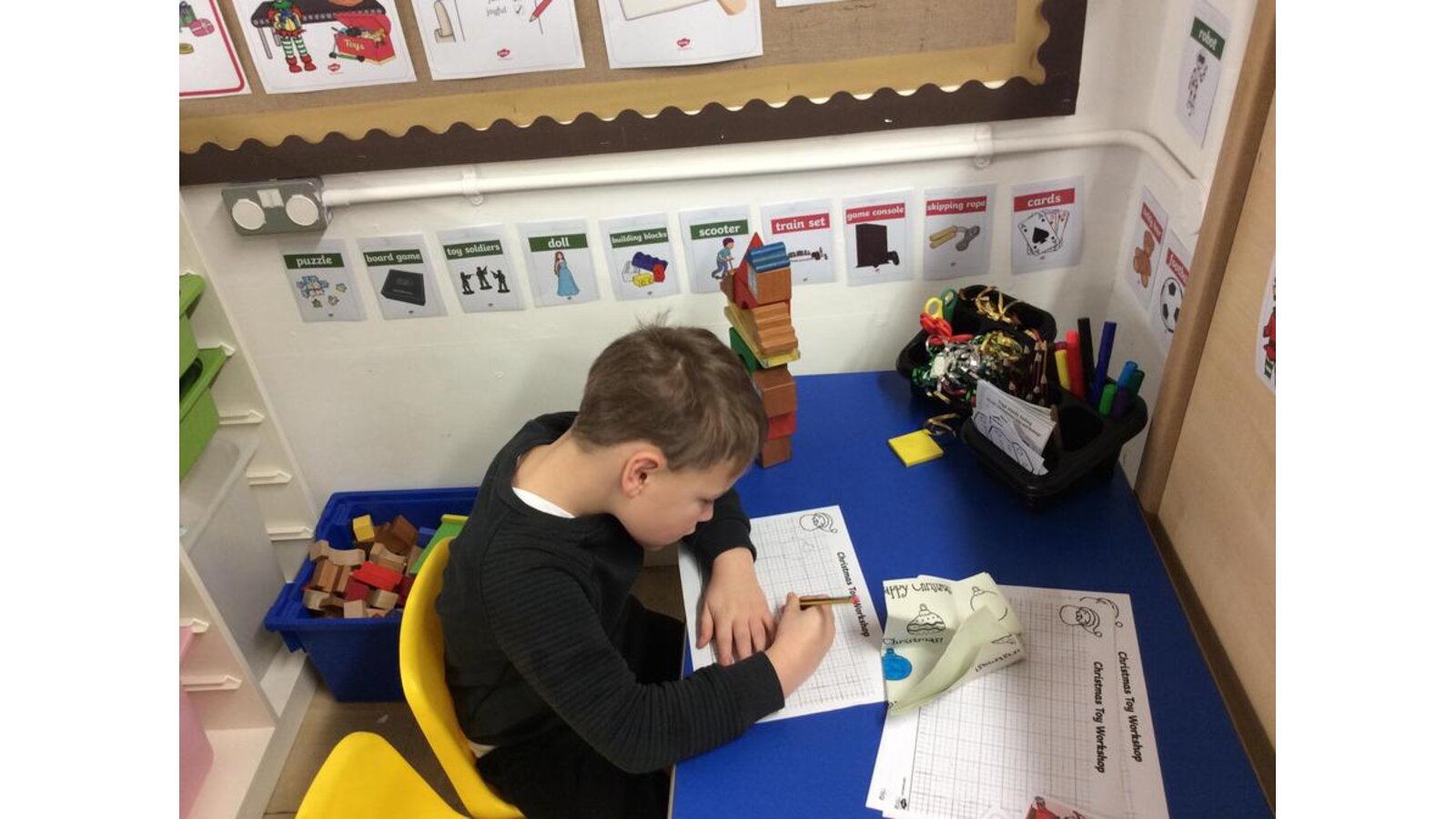 Christmas toy workshop - The children have been enjoying our new role play area. We have been writing lists, tags, wrapping presents, designing toys & making Santa’s elf helper masks!