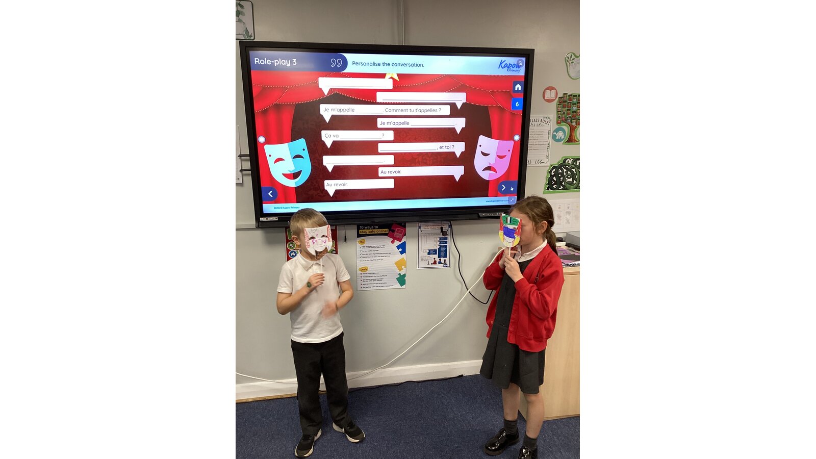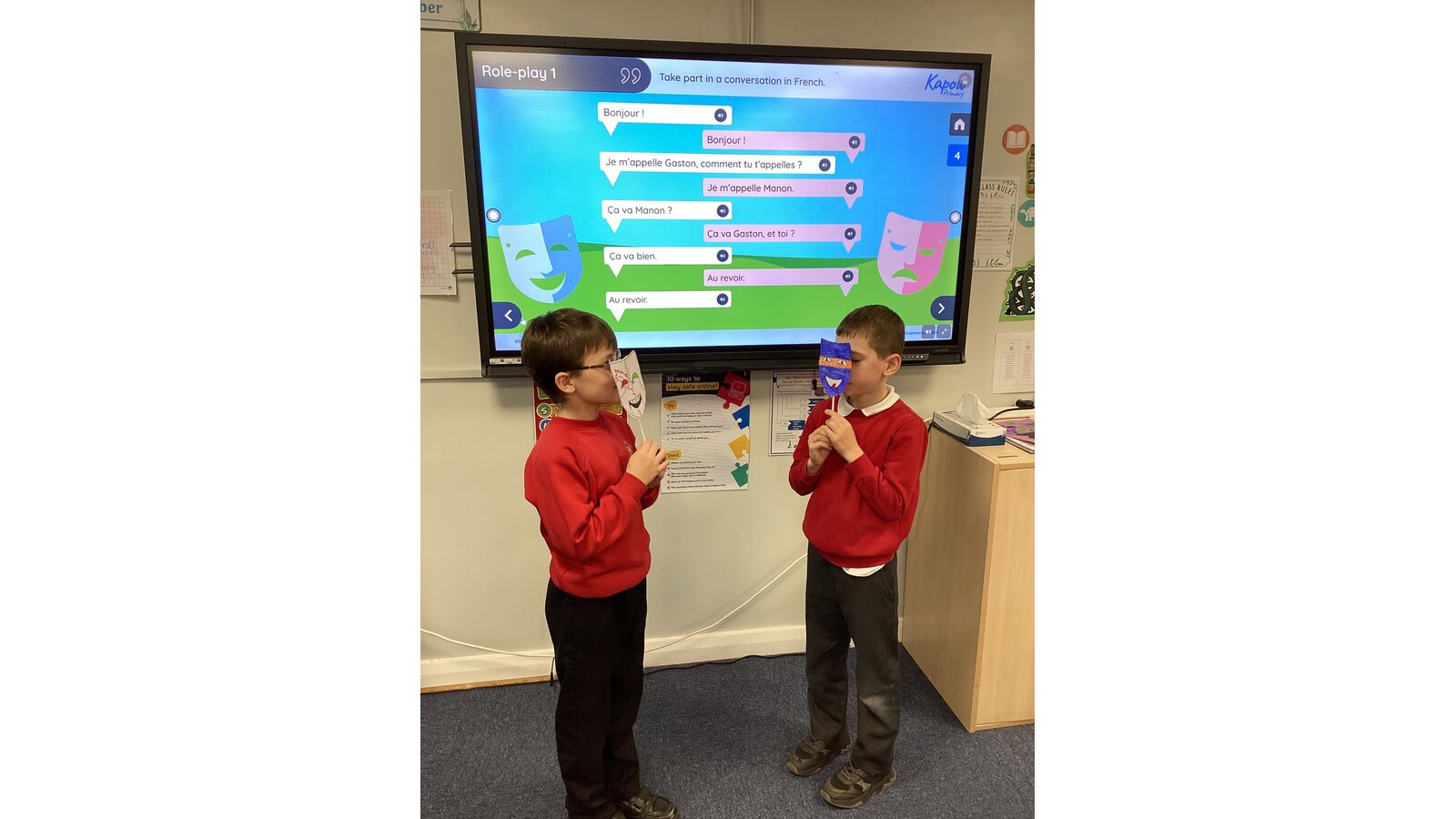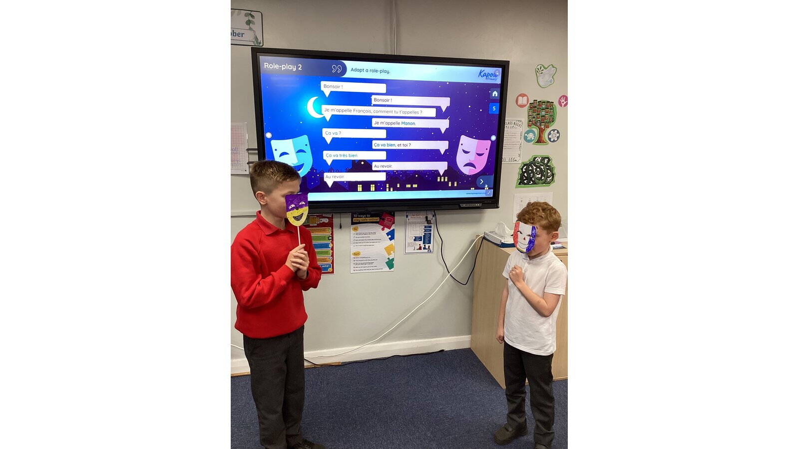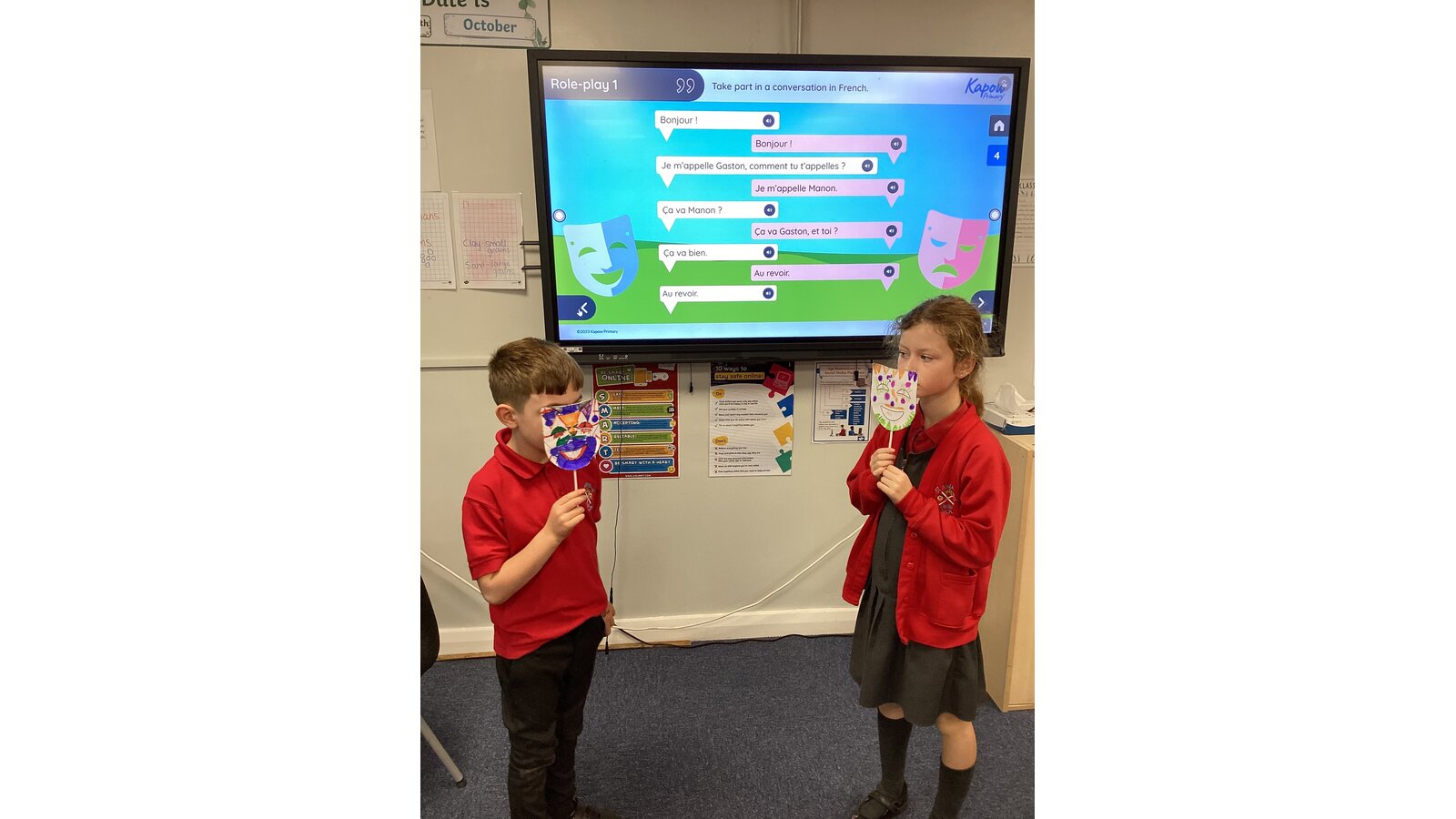 In French we have created a mini role play, practising all the vocabulary that we have been learning to introduce ourselves. Our French accents were very impressive!