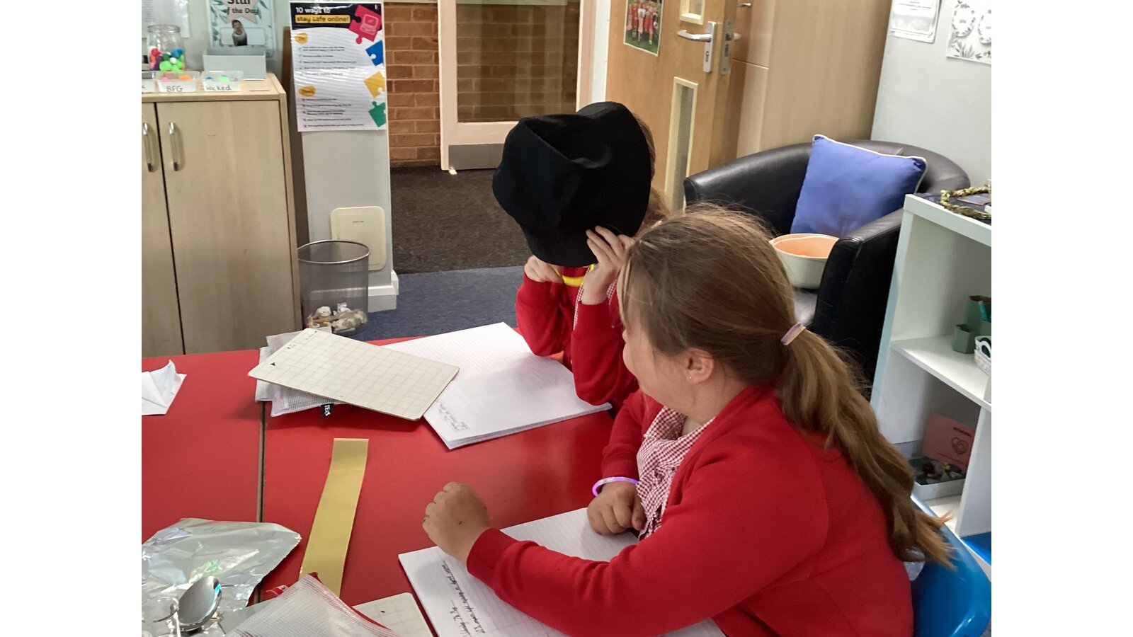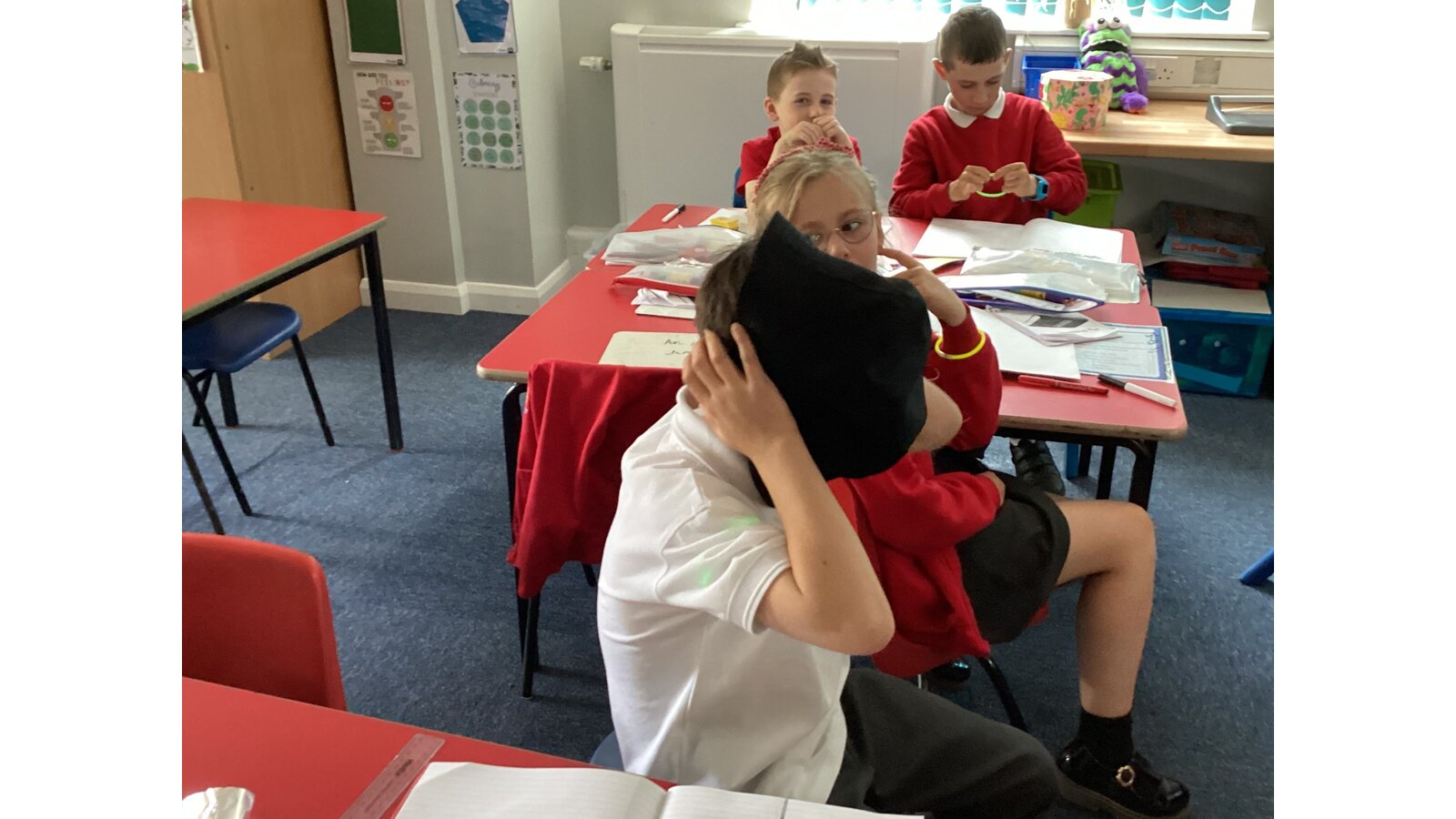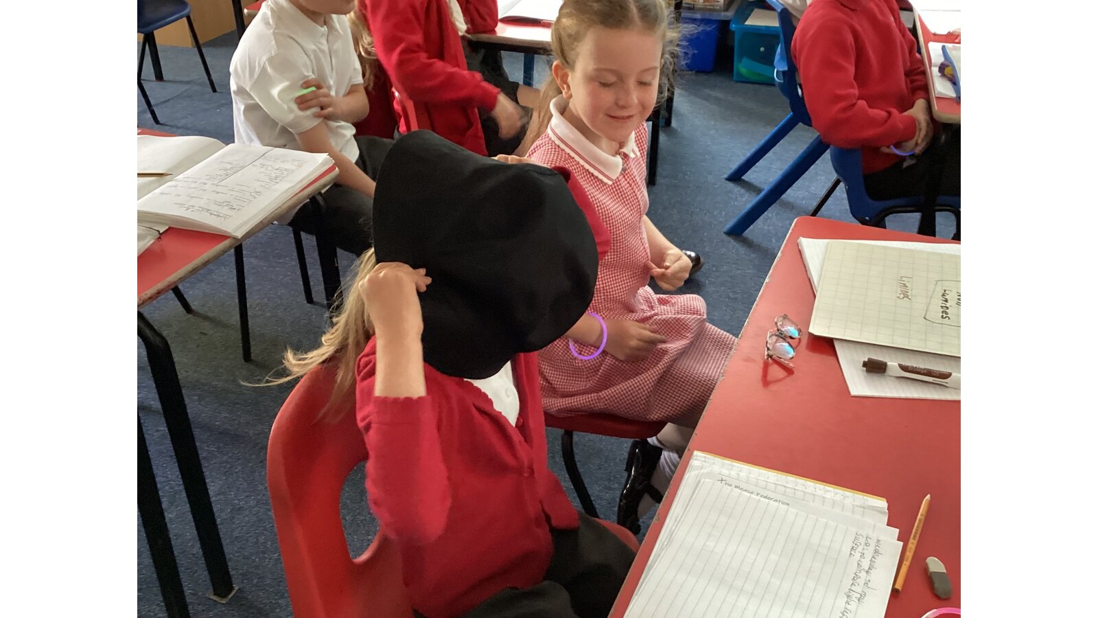 In science we have been learning about light. We have discovered that our eyes are not light sources so without light we wouldn’t be able to see. We tested this by covering our eyes with a black hat. We couldn’t see a thing!