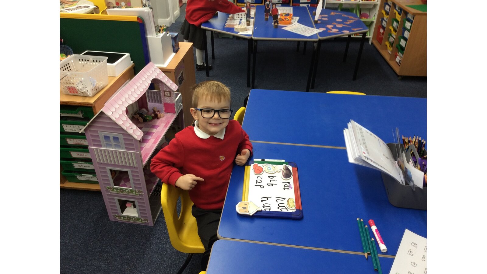 Our EYFS children have been busy practising their phonics and writing skills by using picture cards to build and write CVC words.